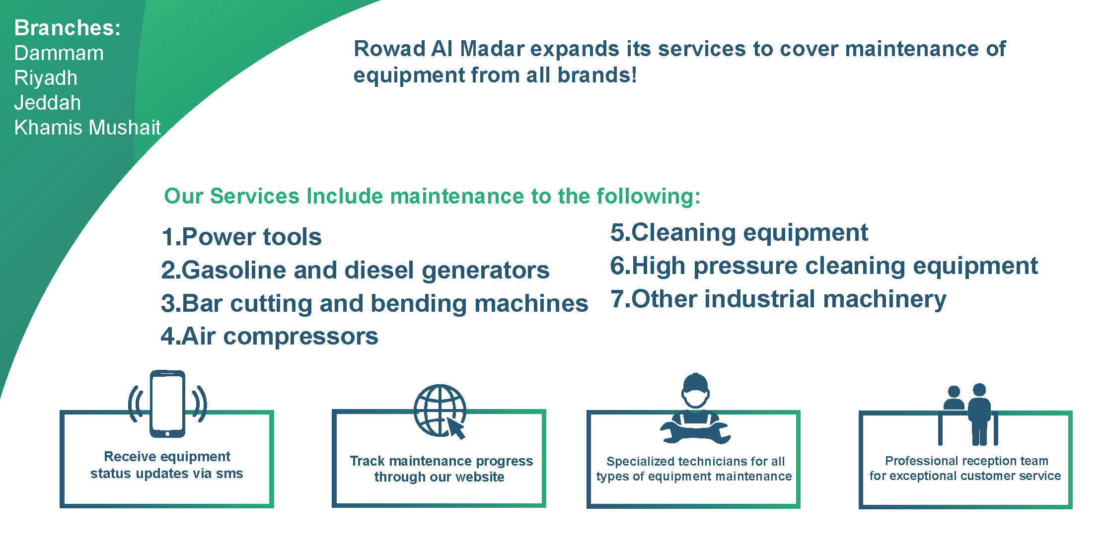 Rowad Al Madar For Maintenance is a leading company in the field of maintaining and operating mechanical and electrical equipment and providing various after-sales services. The company currently includes 5 maintenance branches in the kingdom. These branches operate with an advanced maintenance program that informs the customer of the different stages during the equipment inspection process until receiving it. And because we are always keen on excellence, we provide the best services at the best prices with the help of engineers and technicians specialized in the electrical and mechanical fields.